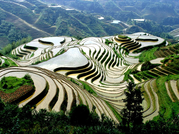早餐后,驅車赴桂林龍勝縣,游覽世界一絕——【龍脊梯田】(約2小時)。感受“青蛙一跳三塊田”“一田三株禾”的奇妙景象,品味“山是龍的脊,水是龍的魂,云是飛天翼,田是登天的梯”美妙意境;下午游覽【義江緣】(約90分鐘)——游客乘竹筏游覽風景如畫的義江風光,游客可以乘船領略壯族歌仙的曼妙歌聲、紅瑤傳奇的長發表演、激情四射的苗家花鼓,觀賞沿岸特色鮮明的桂西北少數民族風情景觀。晚餐品嘗少數民族長街宴,游客們品嘗著滿桌的侗家美食外,感受盛情的東家妹子擰著你的耳朵,踩著你的腳,唱著山歌敬你的酒,酒興正酣的客人還可以和侗家男女一起跳竹竿舞、多耶舞,而侗鄉的“侗族大歌”“蘆笙踩堂”“蘆笙合奏”等精彩表演更加使游客流連忘返。