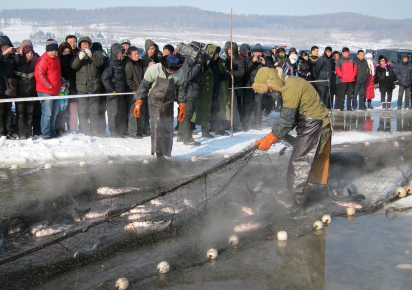 10:00觀看開網捕魚(如遇特殊情況無法觀看恕不提前通知,贈送項目,不參加恕不退費),預示著年年有余。只見千里冰封的湖面上,由漁民鑿開個冰窟窿,開網捕魚,收獲起沉甸甸的大魚與喜悅。鏡泊湖魚生長于冷水環境、生長周期長,魚肉緊致、口感細膩、味道鮮美,自古以來就是進貢佳品。