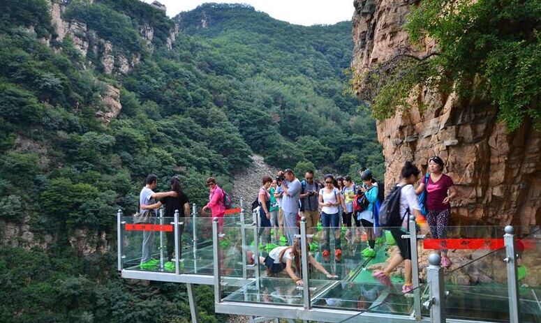 天云山 “北方的張家界,神奇的天云山”翠屏峰、蓮花峰、四姑娘山、玉屏山、拔地而起,直入云霄,既有北方山峰雄偉壯觀之勢,亦有南方山川秀麗險峻之韻。徒步或乘索道登上主峰蓮花峰,向南可觀神奇的石海似中華地圖:向北千溝萬壑盡收眼底,不由的感嘆懸崖峭壁之上棧道的驚險,登頂后,*刺激的時刻到了,走千米高空棧道,來都來了,可不要退縮哦!!