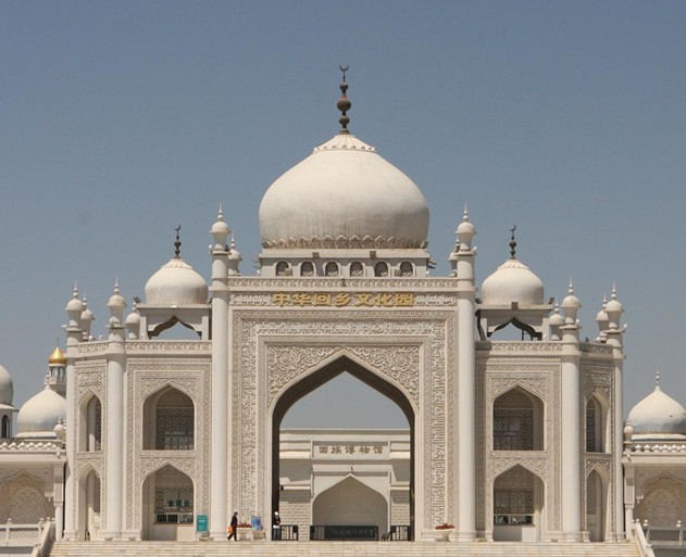 文化縮影之稱的--【中華回鄉文化園】(游覽1.5小時左右):潔白的拱門雄偉磅礴,金色的禮拜寺頂耀眼奪目,絢麗的浮雕彩繪,讓您回博館里讀歷史、禮拜殿中聽邦克、曼蘇爾宮賞歌舞、
