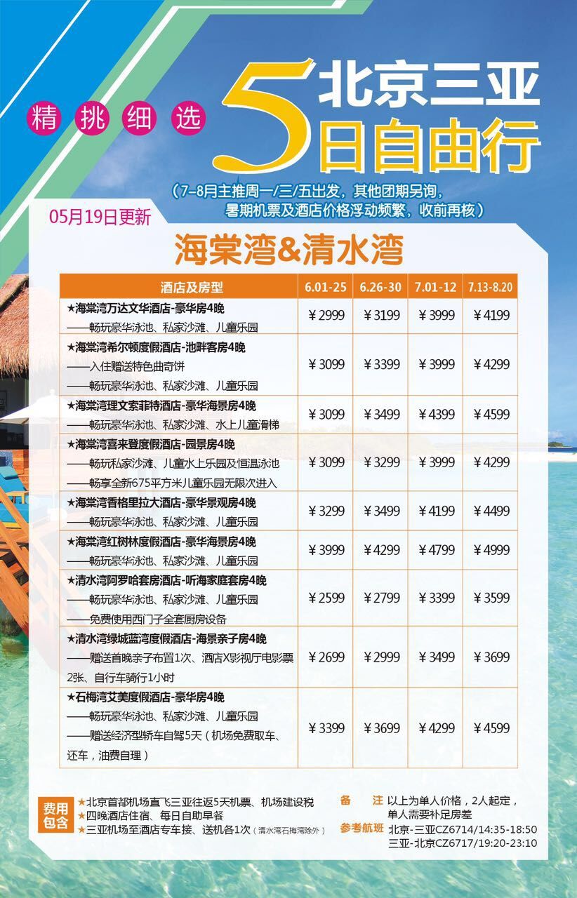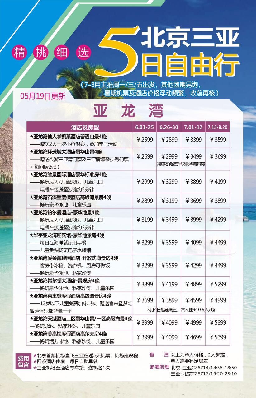 - 費用包含 1、北京至三亞往返機票及機場建設燃油附加稅;