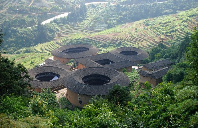 12:30“世界文化遺產”【田螺坑土樓群】依照《考工記圖》中的“明堂五室”進行規劃布局,按照“金木水火土”五行相生次序建造一方四圓的土樓(俗稱“四菜一湯”一座方形土樓--步云樓;三座圓形土樓--振昌樓、和昌樓、瑞云樓;一座橢圓形土樓--文昌樓),是獨具特色建筑形體組合的經典之作,已成為“福建土樓標志性建筑之一”
