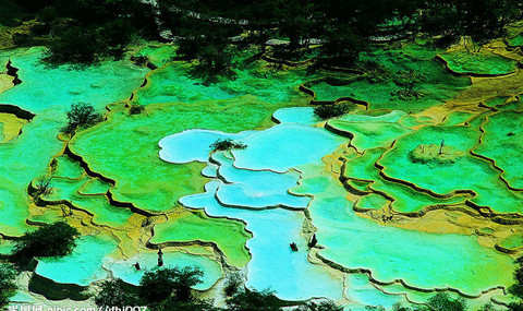(黃龍風景區為龍形的一條溝,溝內有兩條棧道,一條上山棧道,一條下山棧道。黃龍景區所有景點位于下山棧道兩邊)