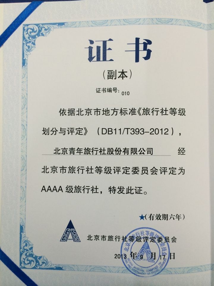 - 4北京青年旅行社榮獲國家AAAA級旅行