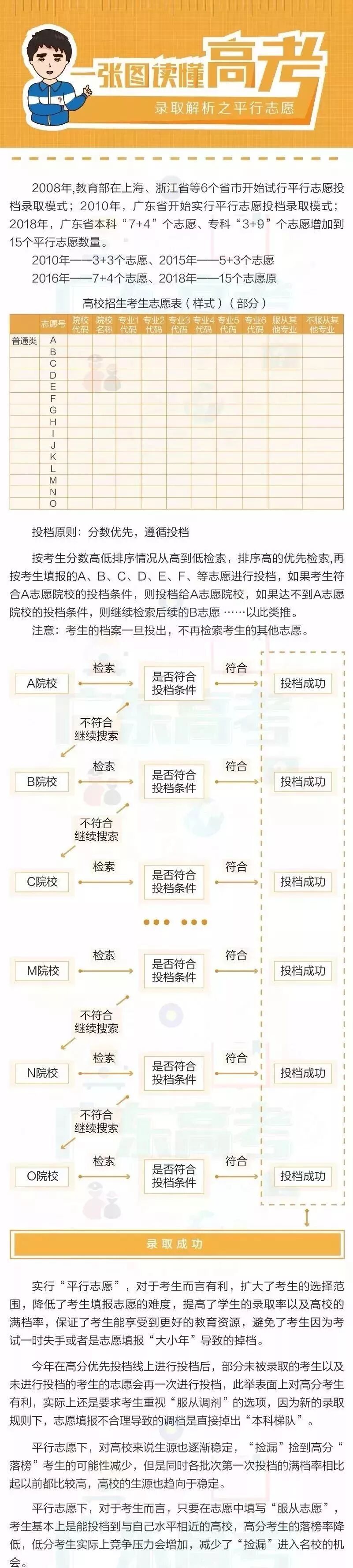 需要提醒考生的是:“平行志愿”不是“平等志愿”也不是“平行錄取”。考生填報的平行志愿有自然順序,并不是只要成績達到所填報的4個平行志愿院校錄取條件,就可能會被4所平行志愿院校同時錄取。而是只要考生檔案投到一所志愿高校后,其他志愿就不再檢索,對每個考生而言投檔錄取機會仍然只有一次。考生的投檔分是考生高考成績總分加上固定的政策性照顧加分后的分數(是判斷考生是否向高校投檔的基本依據)。比如,某考生高考總分是590分,如果他是省優秀學生,按我省政策,他可以享受20分政策性照顧加分,他的投檔分就是610分。位次是考生的投檔分在文史類或理工類排序中所處的具體位置。平行志愿是從高分到低分對考生逐個檢索,當遇到同科類同批次同分考生時,計算機是無法判斷先檢索誰后檢索誰,因此必須分科類對同分考生按照事先確定的排序規則排出一個位次,一個位次對應一個考生。位次是惟一的,計算機可以按位次對考生逐個檢索。那么平行志愿是不是只對高分考生有利呢?省高招辦專業人士指出,平行志愿投檔錄取模式的意義在于,它對于不同批次不同分數的考生都增加了選擇面,每個考生可以同時填上幾所梯度層次的高校,特別是每一批次都有其相對高分考生,選擇面和受益面更明顯,因此平行志愿對高分考生有利的同時,也一樣增加了其他考生的投檔機會。目前平行志愿仍有一些風險,需要引起考生和家長的重視。由于平行志愿投檔錄取模式是采取一次性投出,一輪投檔后不可能補投。考生被投檔后,如果成績相對較低、專業不服從調劑、不符合特殊專業的體檢要求、不符合某些專業的單科成績要求等,高校就可能將檔案退回。而一旦出現退檔,考生只有參加征求志愿填報或下一批次錄取。同時,考生定位不恰當、志愿梯度不合適也是造成落榜的重要因素。如考生填報的4個平行志愿都過高,投檔分未能達到院校的投檔線,考生檔案就不可能被投出。如果考生填報的平行志愿之間沒有適當的“梯度”,則該考生被投檔的機會將大為減少,相當于自己把原有的4次機會變成一次機會,那樣變成了如果A志愿不能投出,而B、C等后續平行志愿院校比A志愿院校要求還高,則后面的平行志愿顯然也都無法投檔。從理論上講,實行平行志愿后,幾所好大學可以同時填報了,但考生和家長必須注意順序。因為平行志愿投檔,是按考生平行志愿所列各院校的先后順序依次檢索的,一旦符合條件,檔案即投向先檢索的高校。如果平行志愿的順序不合理或所填報院校近年錄取分數線相對于自己的分數均較高,也可能導致考生與較好院校失之交臂,甚至無法出檔。如何把握好“平行志愿”之間的順序?請家長和考生記住參考“口訣”——沖一沖、穩一穩、保一保、墊一墊。即把握好沖、穩、保、墊之間的梯度關系。在填報平行志愿時,考生不妨將自己有希望“跳一跳”夠得著的理想學校作為志愿A,將符合自己成績水平的“對口”學校作為志愿B,志愿C填一所“保守”學校,志愿D則填“墊底”學校。這樣的話,幾所學校就形成了梯度配置的順序,可避免“高分低就”帶來的懊悔,也防萬一沒達到較好院校的投檔分,也有相應的院校可讀,不至于落到低批次院校或落榜。在考生志愿信息卡上,每一批次的志愿欄后面都有“服從”欄。該欄是為了增加部分考生被錄取的機會。因此“服從”二字絕對不可忽視,特別是對競爭能力較差的考生,更是如此。服從”欄報考兩層意思:一是“學校服從”,當所填的各個志愿學校都未錄取你時,是否同意調配到其他院校;二是“專業服從”,當你的檔案被某所大學調入后,所填的各個專業均未錄取時,你是否同意調配到其他系科學習。考生“服從分配”,可以增加被錄取的機會,但也要有心理準備,因為有可能是完全不喜歡的專業。1,填寫“是否服從”欄目要明確表態,也不可空著不填,凡“空白”將按不服從對待。3,有范圍的表態,可填報從除哪類院校或除哪些專業之外的任何專業。*本號對所有原創、轉載、分享的內容、陳述、觀點判斷均保持中立,推送文章僅供讀者參考,發布的文章、圖片等版權歸作者享有。部分轉載作品、圖片如有作者來源標記有誤或涉及侵權,請原創作者友情提醒并聯系小編刪除。