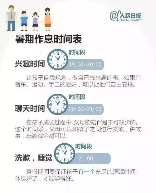 為了幫孩子過個既快樂又有意義的假期,人民日報為您的孩子推薦了一個合適暑假作息時間表。明智的家長已經在假期開始之前,就和孩子一起制定一份合理的時間表,堅持每天做幾件有益的事,從而培養幾項可以受益終身的好習慣,才是對孩子的一生負責!建議家長在與孩子制定暑假計劃時考慮,選擇其中的幾項執行:暑假作業是孩子這個假期必須要完成的任務,一定要按照老師的要求,每天安排一定的作業量,認真完成好暑假作業。從小培養鍛煉身體的習慣,不僅可以提高孩子的免疫力,還能改善孩子的耐力和精神狀態。暑假期間,每天至少應安排 1 小時的鍛煉時間,建議和小伙伴一起進行,在鍛煉之余,還可以增強和同齡人之間的交流。閱讀不僅有助于增長知識,開發智力,還能陶冶情操,轉移電視、游戲的誘惑。暑假正是讓孩子培養閱讀興趣,積累閱讀量的大好時機。建議結合興趣或老師推薦的書單,選擇一本或幾本好書,讓孩子每天在安靜的環境中,認真進行至少 1 小時的有效閱讀。很多孩子英語學不好,主要原因是平時缺少練習。暑假堅持讓孩子每天學 30 分鐘英語,背單詞,讀課文,練習聽力、口語,可以促進良好語感的養成。堅持練字不僅能培養孩子細心、專注的良好習慣,勤奮、堅毅的精神,健康、高雅的情趣,還能促進孩子觀察力、意志力、審美力的發展。建議家長給孩子選擇一套楷書字體,每天堅持練習半個小時。暑假是孩子發展個人興趣的黃金時期,每天應留出一部分時間,讓孩子做自己感興趣且有意義的事情,例如音樂、美術、舞蹈、書法等。家長也可以給孩子適當報一些暑期興趣班,培養孩子的興趣,發展一技之長。暑假期間,家長要有意識地引導孩子做一些力所能及的家務活,適時地鍛煉孩子的獨立生活能力,提高孩子的責任心。好電影可以啟迪我們的心靈,引起情感上的共鳴。列個影單,在假期中好好欣賞幾部好電影。俗話說,讀萬卷書,不如行萬里路。出行不能盲目,暑假的旅游攻略,一定要早早做好。當然還要注意疫情防控,出門要戴口罩,不去疫情中高風險地區。家長們可以根據自己孩子的實際情況,靈活安排假期時間表。但一旦制定了,就要堅定地執行到底,因為習慣的培養,就是不斷地重復。