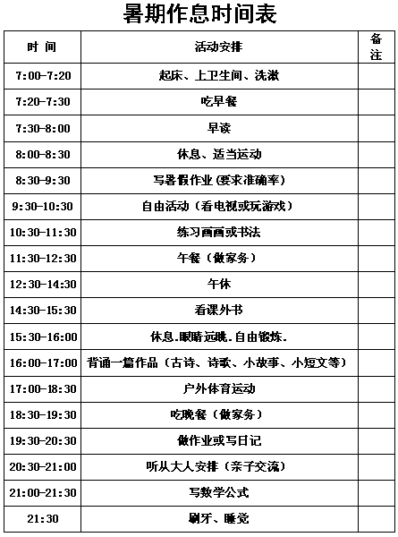 暑假即來了,老師、家長,你覺得孩子應該如何過好這個假期呢?是瘋玩兩個月,每天看電視、玩游戲,晚上熬到很晚才睡,白天睡到中午才起,不知不覺就開學了?還是制定一份科學合理的暑假時間表,過個有意義的假期呢?