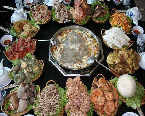 【晚餐菜譜參考】(特色餐廳、野生菌風味餐350元/人)土雞野菌湯、野菌八道、(青桿菌、花菇、雙孢菇、茶薪菇、北方菌、黃落傘、包谷菌、木耳)、葷菜四道、(土雞、老肉卷、脊肉卷、火腿)、時蔬六道、(土豆、豆芽、蓮花白、小白菜、小苦菜、金白菜)、主食:薩尼大餅、米飯、面條、水果拼盤。