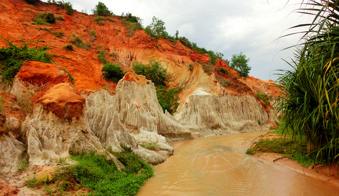 【Fairy stream仙女溪】(約1.5小時)蜿蜒在紅沙谷里的一條小溪,溪水清澈,赤腳走在溪水里,淺淺的水花剛好沒過腳踝,踩在水里的腳底可以感受到沙石的細膩和溪水的清涼。我們逆流而上,在藍天白云的映襯下,左岸紅色的沙化山脊與右邊成片的椰林稻田構成了一幅清新美麗的畫卷。