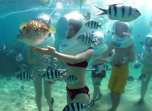 接下來我們達成快艇到海中央來個【太空罩海底漫步】:大家不需要任何的技巧或勇氣,這項專門設計給旱鴨子用來感受神奇海底世界的裝置,如同航天員戴的圓形透明頭盔,讓您能在水深不及6公尺處的海底漫步,而頸部以上皆是空氣,眼鏡與頭發等皆不會潮濕。海底色彩斑斕的魚兒從身邊而過。當您取出特制魚食,在面前喂食,瞬間功夫,周圍聚集了上百條魚。在水中有使用深潛裝備的工作人員隨侍在旁,安全無慮,除了七彩繽紛的熱帶魚與活珊瑚可欣賞,還有機會觸摸到海星與海參,是非常有趣難得的體驗。
