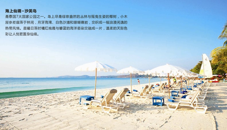 【沙美島國家海洋自然保護風景區】這里就像世外桃源,放眼望去是滿島的椰樹、棕櫚,似乎進入了熱帶叢林,還有美得令人窒息的細膩雪白的沙灘和清澈碧綠的海水。整個海島以藍天白云為背景、銀沙碧海作襯底的美麗海濱,近處可清澈到底,遠眺海天一色,真的不需要太多的旅游景點,只是這種清幽的度假氛圍,已經是*難得的美麗景致了,和島上諸多歐美客一樣做個十足的“閑人”,享受陽光、沙灘、海水所帶來的無限悠閑自在。 您也可于沙美島的藍天綠樹之間進行有益身心健康的徒步運動,盡享與大自然零的接觸。返回芭堤雅,于養生康泰館內享受泰國傳統的【古法按摩】(60分鐘)通過技師嫻熟的指壓技法,讓您舒筋活絡,通體舒暢。(小費自理)