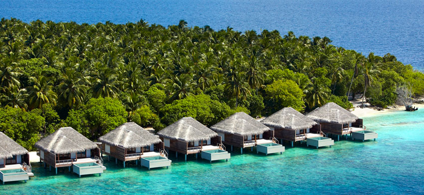 島上由藍綠色的房屋包圍。交通便利,從dusit thani酒店乘水上飛機35分鐘到達首都馬累,再轉乘快艇10分鐘到國內機場。