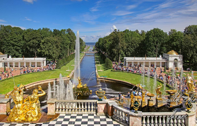夏宮又稱彼德宮:坐落在芬蘭灣南岸的森林中,它始建于1714年,分為上花園和下花園,大宮殿(宮殿外觀)在上花園。這里的建筑豪華壯麗,被譽為“俄羅斯的凡爾賽”