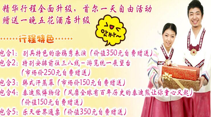 - 1、全程單間差¥1500元/間(韓國普通單間);行李物品的保管費及超重費;行程表中的自費項目及行程表以外的景點門票;
