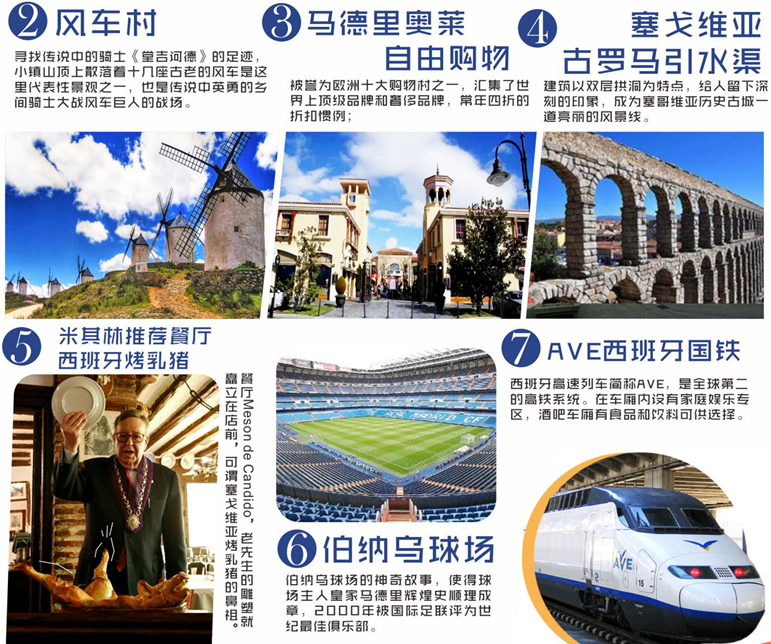 ?婚禮之城--葡萄牙(ya)奧比(bi)多斯(si);安達盧西亞(ya)白(bai)色山城--米哈斯(si);唐吉歌德(de)足跡--西班牙(ya)風車村;皇(huang)家(jia)馬德(de)里俱樂部--伯納(na)烏球場(chang);