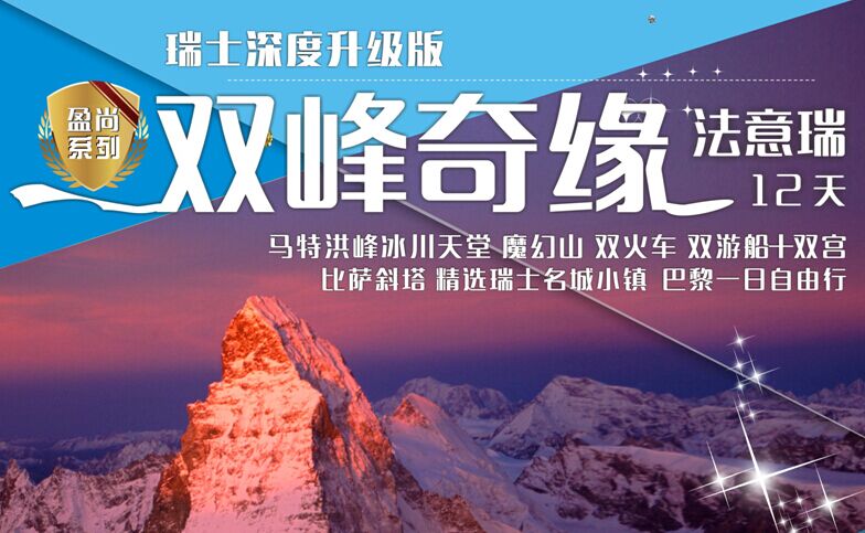 行程特色 雙雪(xue)山(瑞士標志馬特洪峰、達沃斯魔幻山);雙游船(巴黎塞納河游船、貢多拉游船);雙古堡小鎮(西庸城堡、“歐洲好萊塢”楚格);雙宮含講解(巴黎盧浮宮、法國凡爾賽宮);三(san)大度(du)假勝地(滑雪勝地達沃斯、冰城采爾馬特、蜜月之都琉森);世(shi)界遺(yi)產名城(羅馬、佛羅倫薩、比薩、威尼斯)