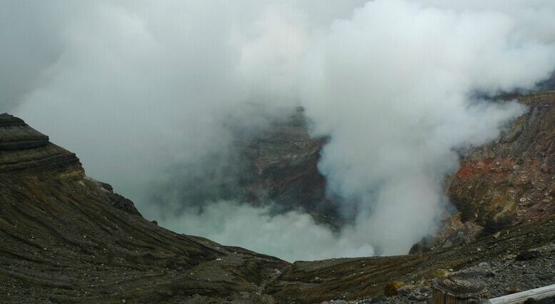 【阿蘇山火山】(纜車自理)世界著名的活火山。順著索道上到標高1506M的山頂就會聞到硫磺的味道,可以近距離的看到火山口噴出煙霧的樣子。只有活火山的周圍有躲避洞。