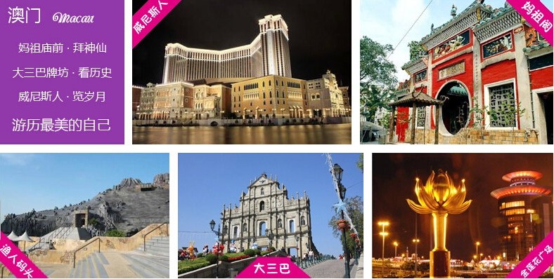 我們乘氣墊船以“飛”一般的速度前往有著東方“蒙地卡羅”賭城"澳門",澳門標志建筑物【大三巴牌坊】【大炮臺】(停留30分鐘)我們必須拍照留念的地方,午餐后奧特萊斯自由活動(約1小時),之后別忘了去看下澳門的富人區【主教山】【媽祖廟】【觀音像】(30分鐘),【金蓮花廣場】(15分鐘),參觀澳門賭城特色的娛樂場,讓您旅游更加豐富多彩!后送回酒店休息!