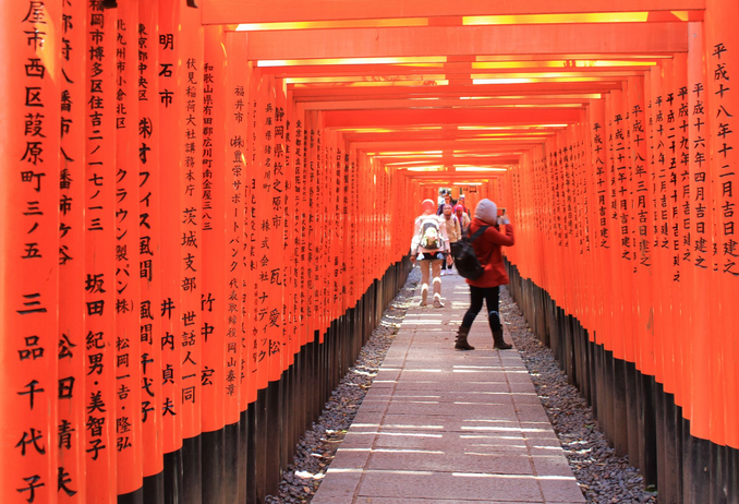 【伏見稻荷大社】位于稻荷山的山麓,這里主要供奉以宇伽之御魂大神為首的諸位稻荷神,是深受京都人愛戴的神社之一,香火最為旺盛。稻荷神就是狐貍神,被認為保佑五谷豐收,衍生為商業繁榮。伏見稻荷大社內,到處可見口中叼著稻穗或谷物的狐貍,接受人們的膜拜與禮敬。伏見稻荷最大的看點是千本鳥居,在漫長的山路上豎立著無數根鮮紅的鳥居,都是個人或企業捐贈的。