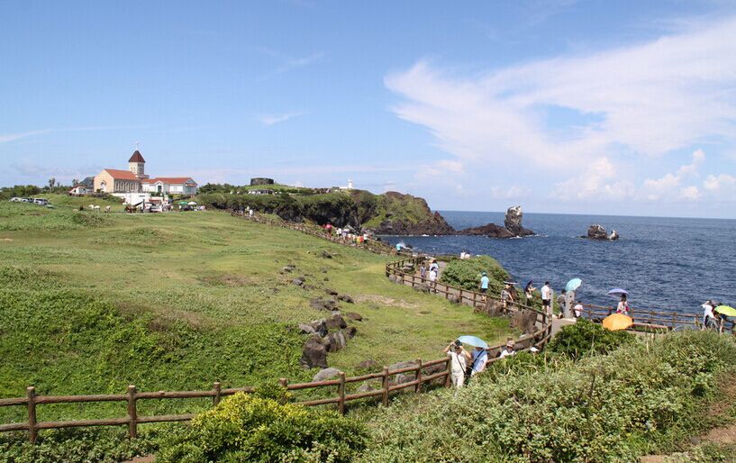 【涉地可支】(停留時間約30分鐘)涉地可支位于韓國濟州島東部海岸的一端。“涉地”是這一地區古代的名稱,“可支”是濟州島方言,意思是指外凸出的地形。這片海岸岬地因為作為韓劇《ALL IN》中的場景而變成熱門景點。矗立在坡地上的白色美麗教堂、修女院建筑十分顯眼,具有歐洲風味,遠遠地就能吸引住眾人的目光。