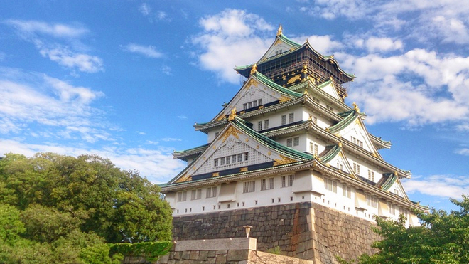【大阪城公園(不登城)】(約40分鐘),公園內除了著名的大阪城天守閣外,還有大手門、千貫櫓、火硝藏等13座被指定為重要文化財產的古建筑以及梅林和西丸庭園等,動漫【海賊王】世界政府直屬組織海軍本部取景于此;【名偵探柯南】中大阪雙重迷案‘TV263’在這里我們可以看到著名的極樂橋和天守閣本尊。
