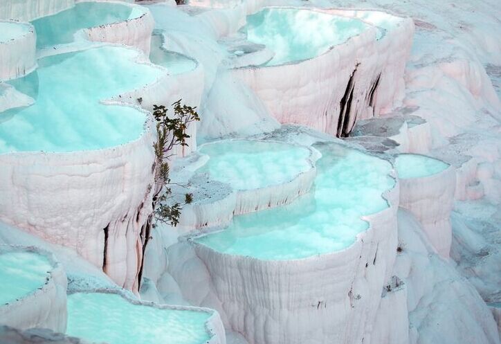 ※ 棉花堡:棉花堡(Pamukkale)在土耳其的紡織工業重鎮代尼茲利(Denizli),位于西南部山區。土文Pamukkale由Pamuk(棉花)和Kale(城堡)兩個字組成,棉花是指其色白如棉,遠看像棉花團,其實是堅硬的石灰巖地形。城堡是說它由整個山坡構成,一層又一層,形狀像城堡,故得名棉花堡。此地多溫泉,溫泉自洞頂流下,將山坡沖刷成階梯狀,平臺處泉水蓄而成塘,人可坐在里面泡溫泉。