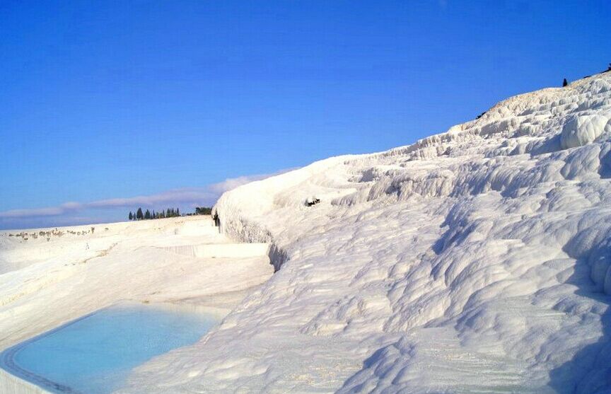 ※ 棉花堡:棉花堡(Pamukkale)在土耳其的紡織工業重鎮代尼茲利(Denizli),位于西南部山區。土文Pamukkale由Pamuk(棉花)和Kale(城堡)兩個字組成,棉花是指其色白如棉,遠看像棉花團,其實是堅硬的石灰巖地形。城堡是說它由整個山坡構成,一層又一層,形狀像城堡,故得名棉花堡。此地多溫泉,溫泉自洞頂流下,將山坡沖刷成階梯狀,平臺處泉水蓄而成塘,人可坐在里面泡溫泉。