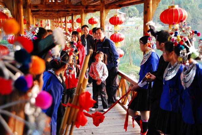 早餐后,驅車赴桂林龍勝縣,游覽世界一絕——【龍脊梯田】(約2小時)。感受“青蛙一跳三塊田”“一田三株禾”的奇妙景象,品味“山是龍的脊,水是龍的魂,云是飛天翼,田是登天的梯”美妙意境;下午游覽【義江緣】(約90分鐘)——游客乘竹筏游覽風景如畫的義江風光,游客可以乘船領略壯族歌仙的曼妙歌聲、紅瑤傳奇的長發表演、激情四射的苗家花鼓,觀賞沿岸特色鮮明的桂西北少數民族風情景觀。晚餐品嘗少數民族長街宴,游客們品嘗著滿桌的侗家美食外,感受盛情的東家妹子擰著你的耳朵,踩著你的腳,唱著山歌敬你的酒,酒興正酣的客人還可以和侗家男女一起跳竹竿舞、多耶舞,而侗鄉的“侗族大歌”“蘆笙踩堂”“蘆笙合奏”等精彩表演更加使游客流連忘返。