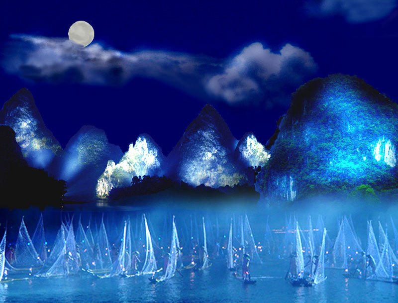 晚上:晚餐后觀看超大型山水實景演出—【印象·劉三姐】(約70分鐘),它由著名導演張藝謀、樊躍、王潮歌及國家一級編劇梅帥元等人歷時多年精心打造而成,是了世界第一部大型山水實景演出。它將桂林山水和“劉三姐”傳說進行巧妙的嫁接和有機組合,讓自然風光和人文景觀交相輝映,被稱為“與上帝合作之杰作”。
