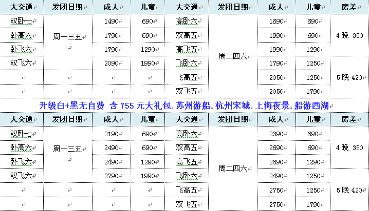 產(chan)品升(sheng)級 報名時交納700元/人,享受價值(zhi)755元--蘇州游船120元/人、船游西湖55元/人、杭州宋城千古情300元(yuan)/人(ren)、上海海陸空夜景280元(yuan)/人
