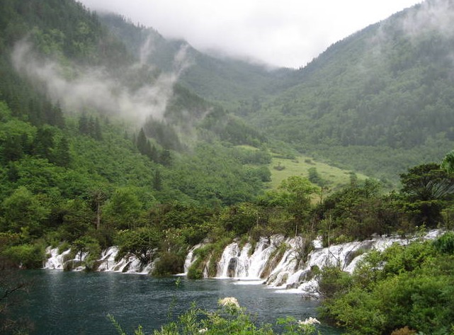 九寨溝 集翠海、疊溪、彩林、雪峰和藏族風情于一體,以其自成天成、美麗絕倫的自然風光而成為中國著名的風景名勝區。九寨溝的藍天、白云、雪山、森林、盡融于瀑、河、灘、綴成一串串宛若從天而降的珍珠;九寨溝分為則查洼溝、日則溝、樹正溝)三條溝,呈“丫”字分布;整個構成了一個五彩斑讕、絢麗奇絕的瑤池玉盆,一個原始古樸、神奇夢幻的人間仙境,一個不見纖塵、自然純凈的“童話世界”。