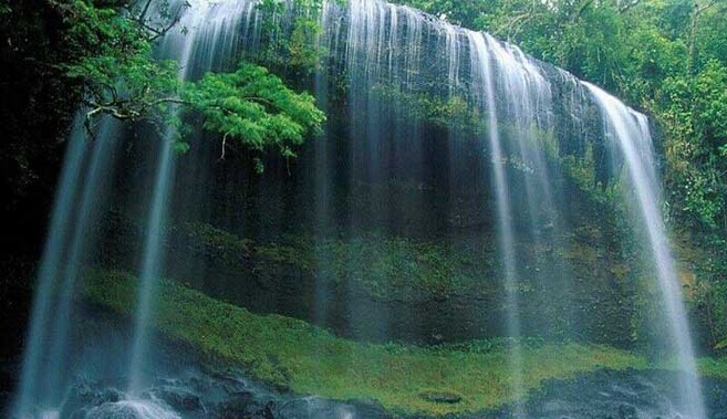 【莫里瀑布】——(游覽時間約1.5小時)位于瑞麗市東北20公里處,又稱扎朵瀑布。清澈的泉水從40米高的懸崖陡壁傾瀉而下,有“疊水如棉,不用弓彈花自散”的景象,似一匹巨幅白綢在空中迎風飛舞,高峰懸崖間雪飛云涌,響聲雷鳴,景觀十分奇特。