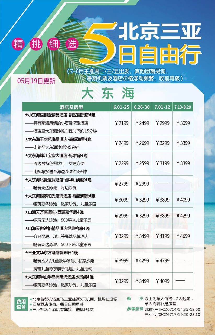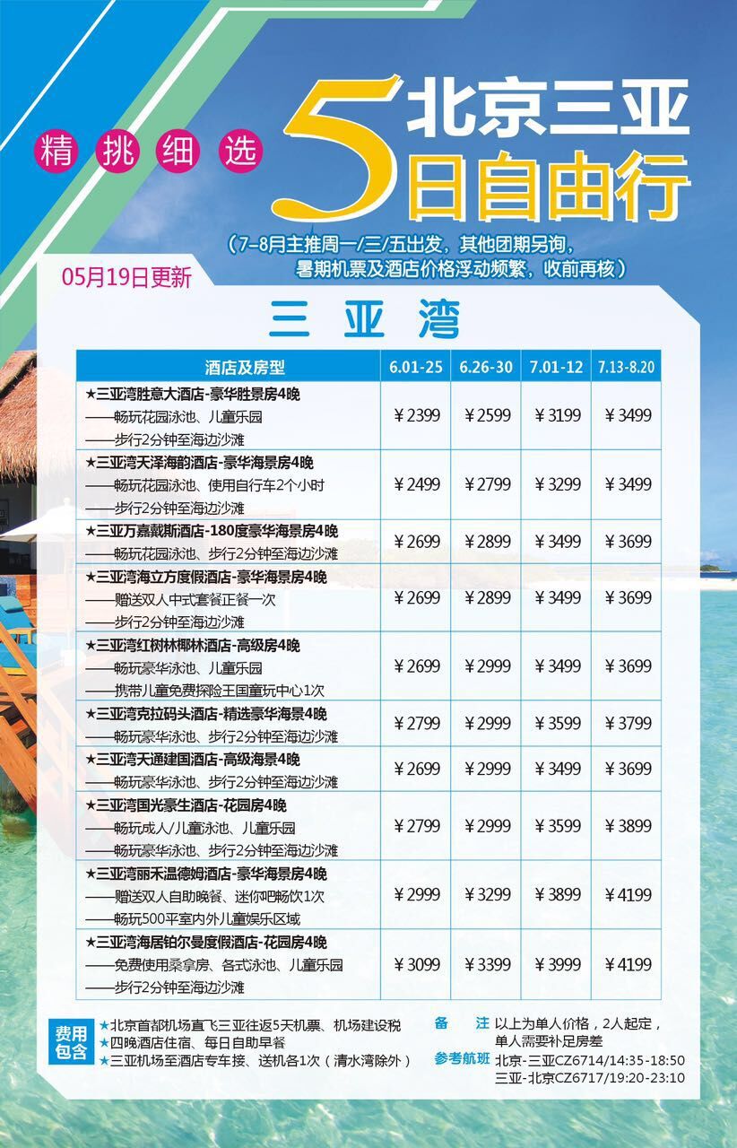 - 費用包含 1、北京至三亞往返機票及機場建設燃油附加稅;