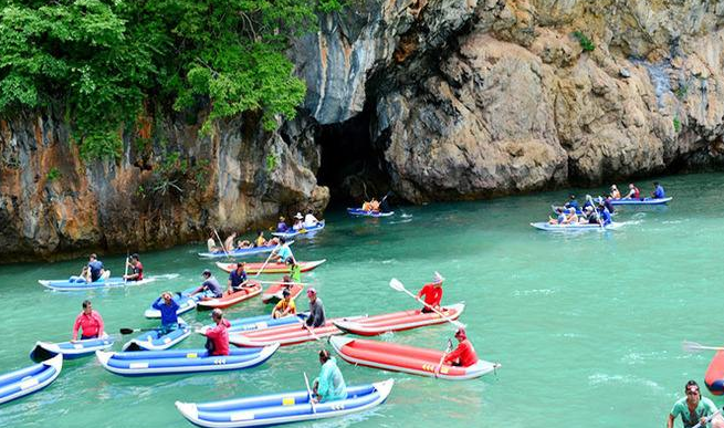 驅車前往攀牙府,日本電視臺NHK世界神跡傳說節目,所追蹤報導的攀牙灣府國家保護區【象牙寶穴】(游覽時間約120分鐘)探尋攀牙府象山神奇傳說的腳步,其外觀神似巨象的模樣襯的蔚藍的天空及清翠的山林背景,讓人仿若進入探險世界。此洞穴是公元2000年底新開發的景點為降底對洞內珍貴自然景觀及鐘乳石的環境沖突,每天限定(200名游客)入內。參觀者帶著頭燈搭乘兩人一組由工作人員劃行【橡皮船泛舟】進入洞內,進入洞內請不要拍照,為保護洞內原始生態(注:請付工作人員小費50銖/人);沿著地下河緩緩進入眼簾的奇特景觀將讓您有意想不到的驚喜。之后換乘【竹筏】前往傳說中可走晦氣帶來好運的【幸運池】。隨后帶您來一趟大自然之旅: 乘坐聰明絕頂的大象跋山涉水悠游在叢林之中,讓您深刻感受大自然的洗禮。