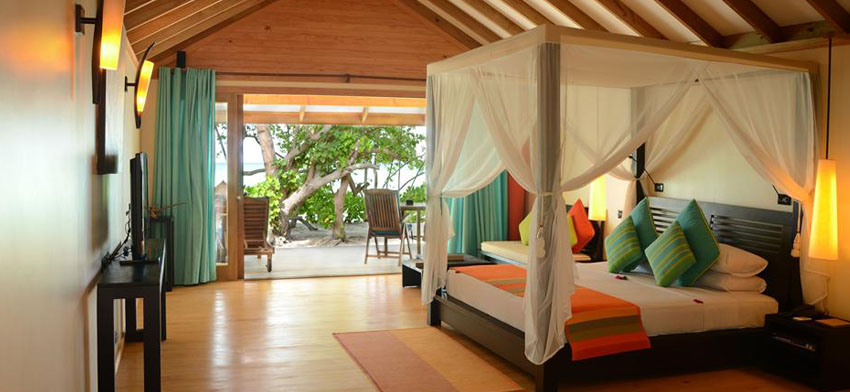 能觸摸到的奢華,帶按摩浴缸的海灘別墅為客人提供更寬敞的臥室面積、四海報的床上,私人庭院的木質甲板上有按摩浴缸