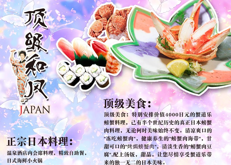 ☆用餐:日本料理與中餐相比,比較清淡簡單,中國團隊在日本用餐可能會有不習慣之處。請各位團友有心里準備,此經歷也是對日本習俗的一個了解。旅程中有時會遇上塞車,**好自備一些零食,以便饑餓時有東西吃。