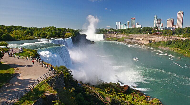 早餐后乘車前往【尼亞加拉大瀑布】,瀑布位于加拿大和美國交界的尼亞加拉河中段地區,有著世界七大奇景之一的美譽, 同時也是世界三大瀑布之一。它以宏偉的氣勢,豐沛而浩瀚的水汽,震撼了所有的游人。從伊利湖滾滾而來的尼亞加拉河水流經此地,突然垂直跌落51米,巨大的水流以銀河傾倒之勢沖下斷崖,聲及數里之外,場面震人心魄,形成了氣勢磅礴的大瀑布。抵達后在尼亞加拉大瀑布畔自由活動(約1.5小時),期間建議行程:自費搭乘瀑布游船(約1小時)(溫馨提示:特殊情況游船關閉,由此給您帶來的不便敬請理解)從1846年初航開始,“霧中少女”號瀑布游船始終是尼加拉瀑布最有名的玩樂方式,穿上薄薄的藍色雨衣,搭上那艘白色的雙層游船,最刺激的瀑布之旅便展開了。看起來頗有歷史卻很堅固的霧中少女號,會從河岸一路勇猛地駛向瀑布,并進入瀑布的馬蹄形中轉圈,豐沛的河水有如萬馬奔騰向你撲來,頓時船上的陌生人似乎都變成同船共渡的淪落人,就在一片朦朧水花中,你可以親身感受瀑布的氣勢和威力。脫離暴風圈之后的霧中少女號,有如歷劫歸來的小船,搖搖晃晃地飄向美國瀑布,天氣晴朗時,太陽光和水氣交織出又長又美的彩虹,投射在名副其實的“彩虹大橋”前。